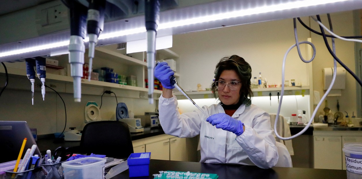 Por Silvia Naishtat - Natacha Reynoso toma una muestra de una semilla de trigo en el laboratorio de Bioceres en Rosario.